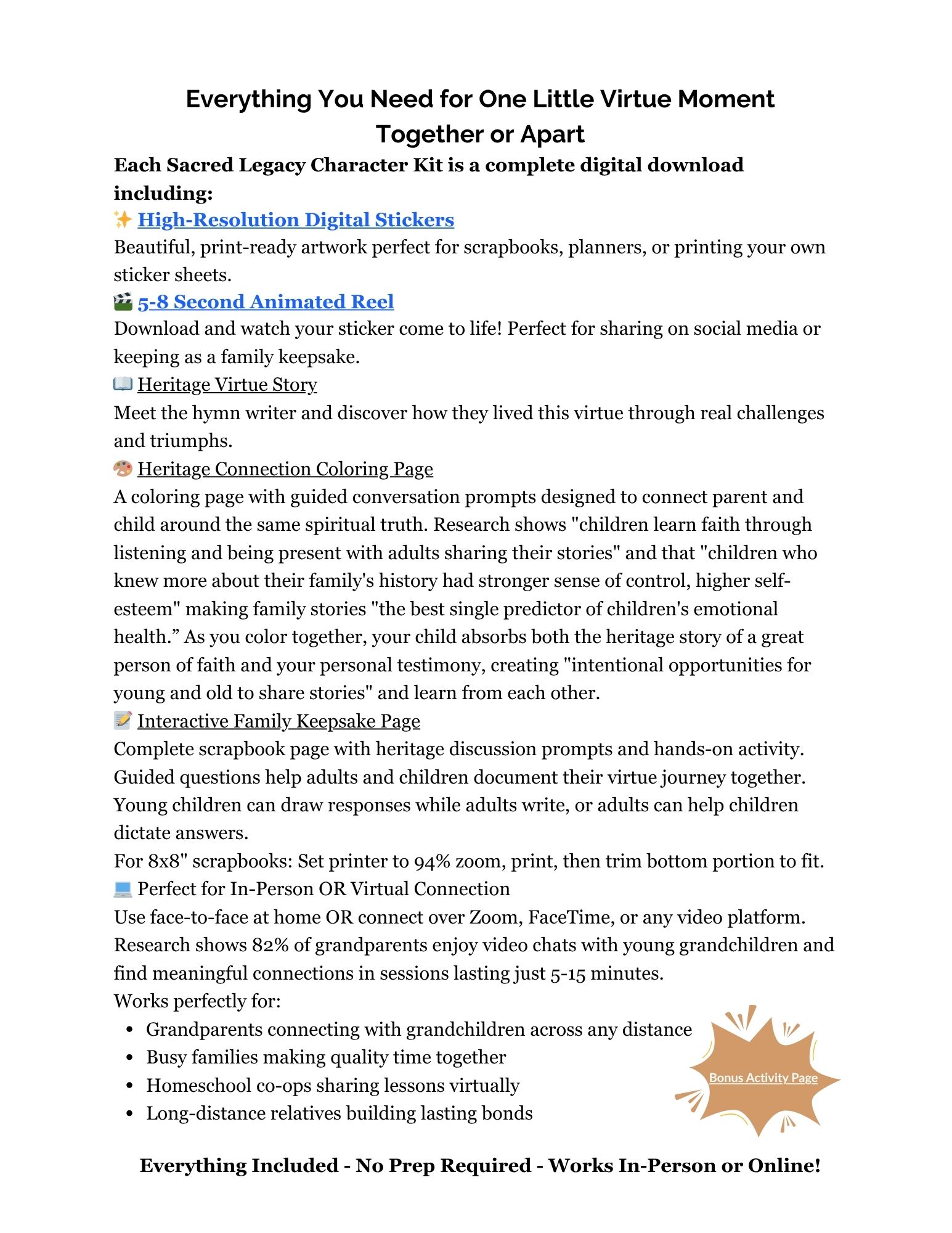 Studies show children who know family faith stories have higher self-esteem and emotional health. This kit creates intentional opportunities for intergenerational storytelling while teaching biblical virtues through engaging activities that work both online via Zoom/FaceTime and in-person.